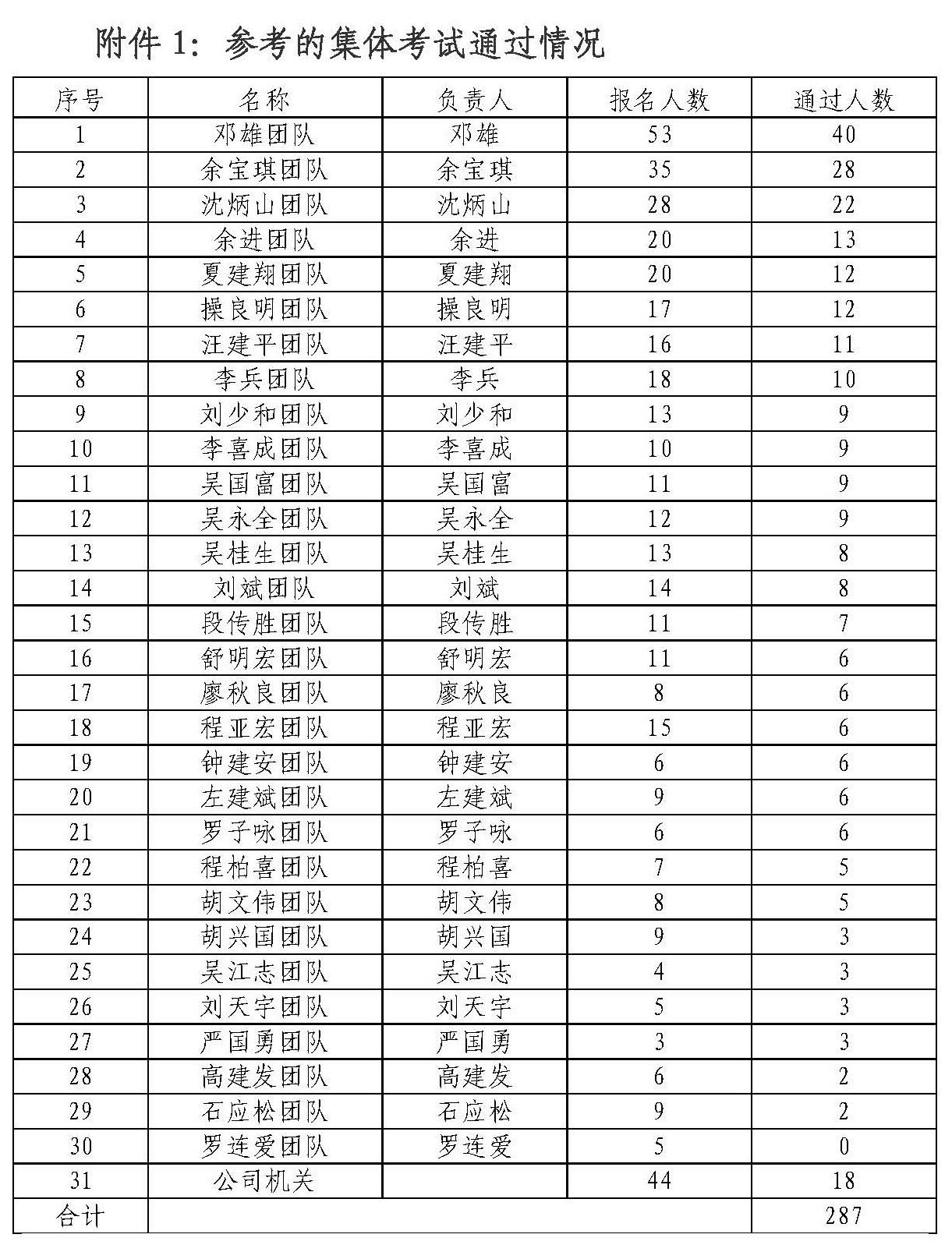经公司研究决定:对邓雄、余宝琪、沈炳山、余进、夏建翔5个积极参与培训并取得考试好成绩的团队及其考试合格人员,给予通报表彰;对部分不报名、不积极参与培训且考试不合格人员,予以通报批评。希望受表彰的集体和个人,谦虚谨慎,再接再厉,争创新的佳绩。也希望本次没有积极组织培训考试的集体和个人,要以受表彰的先进集体和个人为榜样,加强专业理论和专业技术学习,不断提高工作能力和水平,争取在下一次考试中考出好成绩。